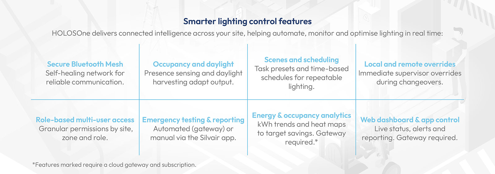 HOLOSOne is Holophane’s advanced lighting control solution, combining secure Bluetooth Mesh technology with expert-led design, commissioning, and support. Built to unify lighting infrastructure across production zones, logistics areas, and exterior sites, HOLOSOne provides you with complete control and fewer headaches.